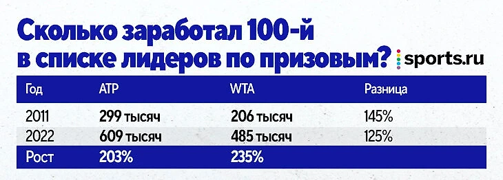 Рост призовых в женском туре тоже не поспевает за мужским. В ATP с 2011-го по 2022-й минимальный призовой фонд на турнирах вырос на 17%, а в WTA – на 9%. А если в мужском туре брать не отдельные турниры, а средние минимальные показатели, то рост еще больше – около 25%.