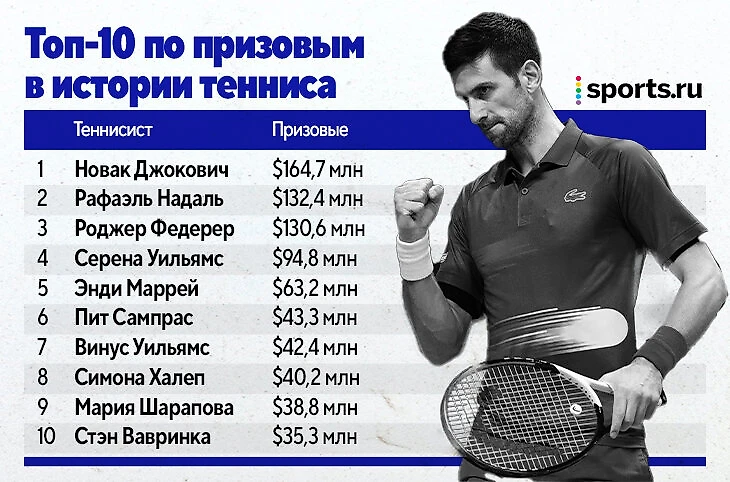 В конце сезона Новак Джокович выиграл итоговый турнир ATP и получил за это рекордные для тенниса призовые – 4,7 млн долларов. А вообще за карьеру серб на корте выиграл уже 164,7 млн – и отрывается ото всех в историческом рейтинге больше чем на 30 млн.