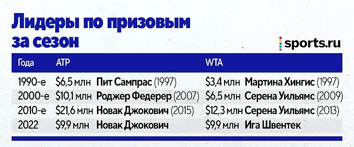 Только в этом сезоне сумма получилась примерно равной – Новак Джокович обошел Игу Швентек чуть меньше чем на 100 тысяч. Но тут нужно учитывать, что серб пропустил полсезона, а Швентек почти весь год доходила до финалов и брала титулы.