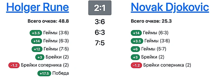 за каждый сет, чем лучше счёт, тем больше очков. Например за победу 6:0 получаешь +18 очков, за 6:3 +14 очков. За проигранный сет также начисляются очки, но значительно меньше. За 3:6 получаешь +3.5 очка, за 0:6 штраф -1,5 очка
