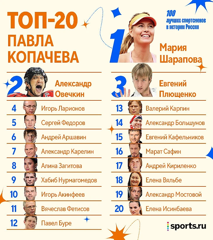 На Sports.ru продолжаются выборы «100 лучших спортсменов в истории России» – и чем ближе финал голосования (31 марта в 23:59 по московскому времени), тем меньше ясности, кто победит. В анкетах редакции Мария Шарапова – обладательница пяти «Больших шлемов», экс-первая ракетка мира – совсем чуть-чуть уступила Александру Овечкину, но в любом случае все решится в пользовательском голосовании. У вас еще есть время, чтобы повлиять на итоги проекта.