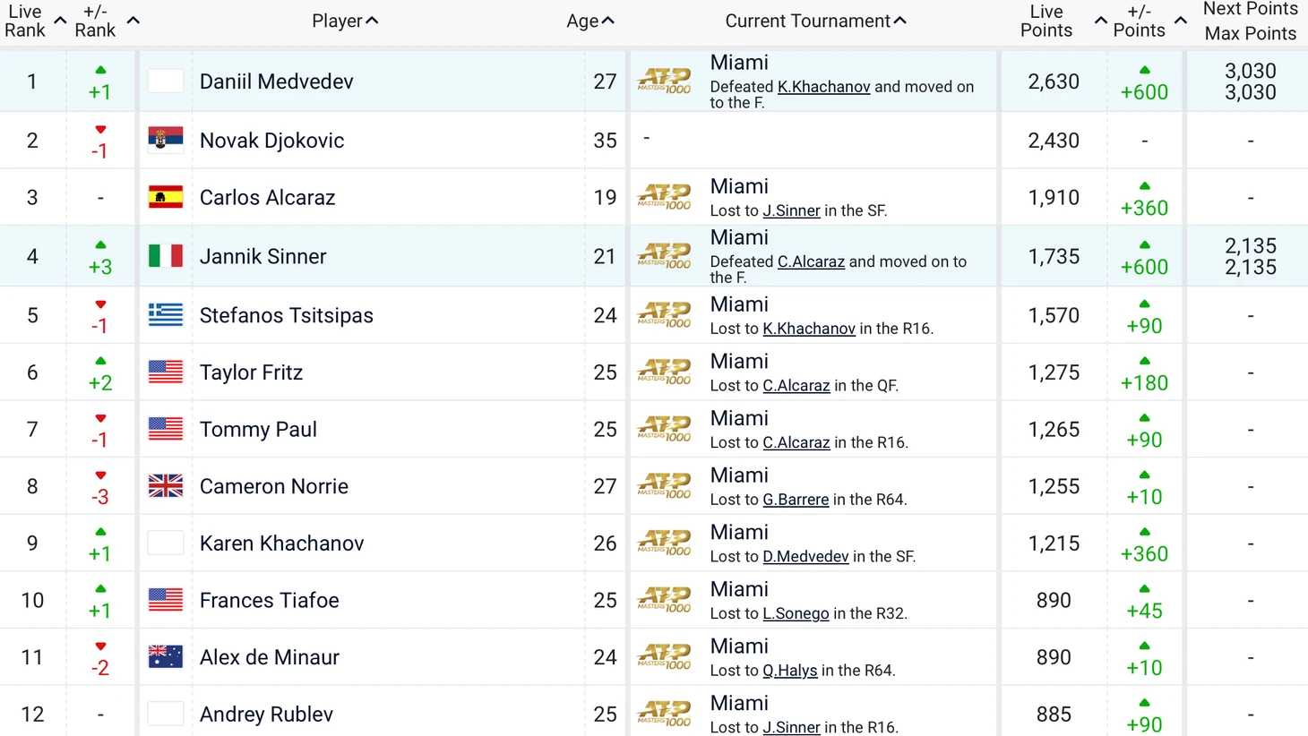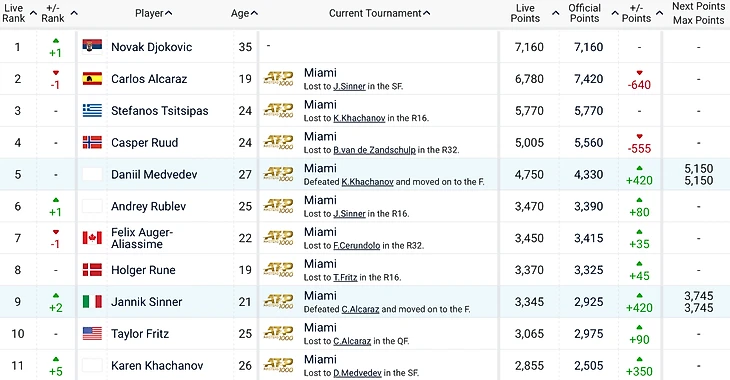 В рейтинге ATP, который будет опубликован в понедельник, произойдут существенные изменения. Во-первых, Карлос Алькарас не смог защитить свой прошлогодний титул в Майами, проиграв в полуфинале. За счет этого Джокович, который даже не был допущен до турнира из-за отсутствия вакцинации от ковида, снова станет первой ракеткой мира. В первой десятке произошло еще одно изменение - Рублев обошел Феликса Оже-Альяссима и стал шестой ракеткой мира. Другой россиянин - Карен Хачанов - поднялся на пять строчек и занимает теперь 11-е место.
