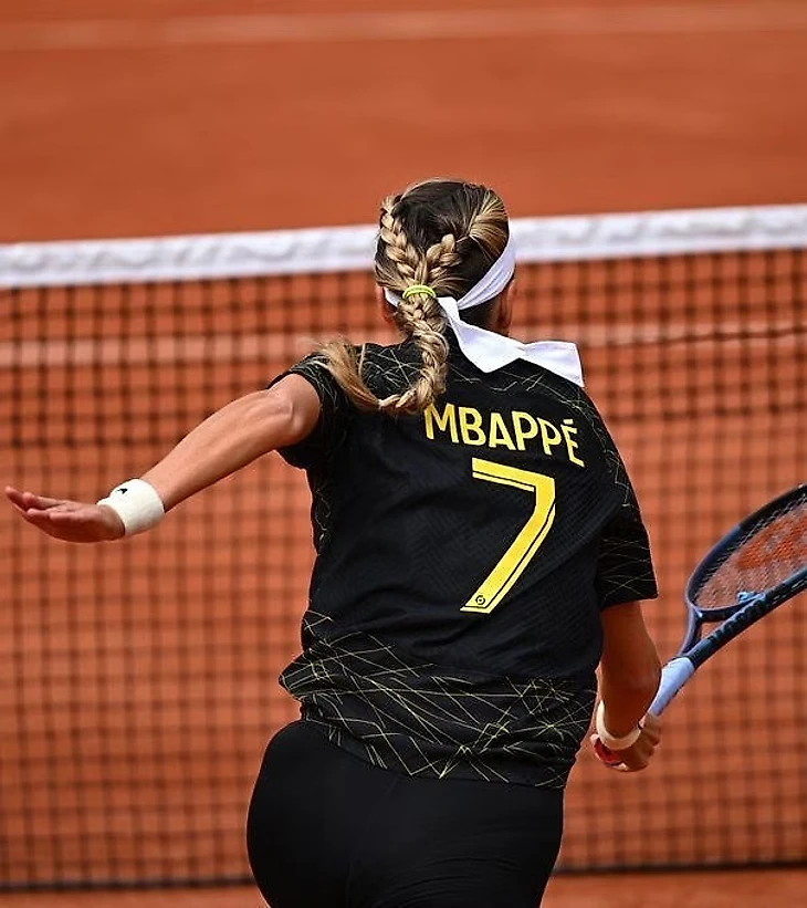 Теннисистка Виктория Азаренко была замечена в футболке Килиана Мбаппе во время одной из тренировок на грунтовых кортах Ролан Гаррос перед Открытым чемпионатом Франции 2023 года.