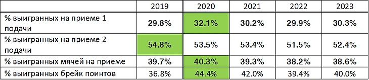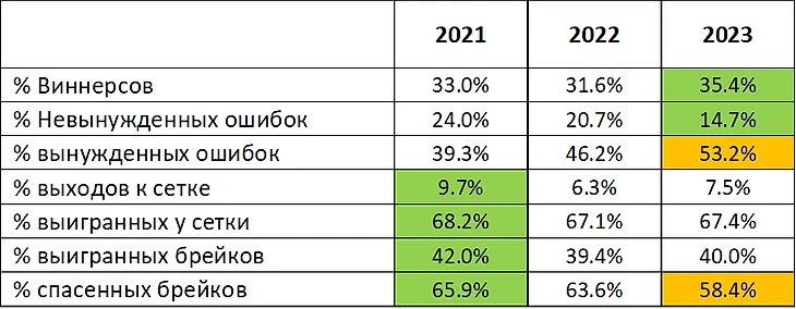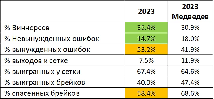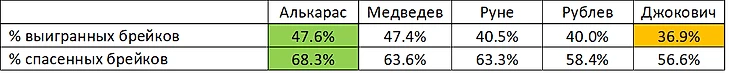 % выигранных и спасенных брейков уступает топам, находится на уровне Руне и даже чуть выше Новака образца текущего момента в сезоне 2023. В целом эти показатели коррелируют с такими показателями как игра на подаче и приеме Андрея.