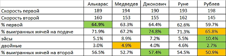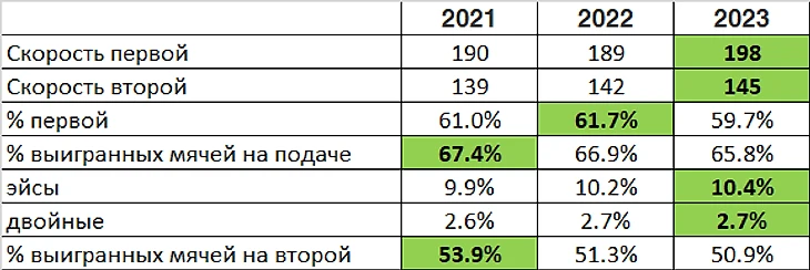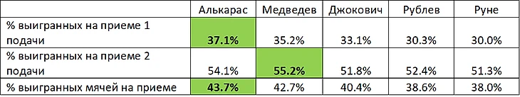 Здесь показатели Андрея находятся на хорошем уровне, но видна разница между топами первого и второго эшелона к коим относится Андрей на данный момент. В целом его показатели конечно уступают Даниилу и Карлитосу – однако почти идентичны с показателями Руне и совсем недалеки от текущего Джоковича.