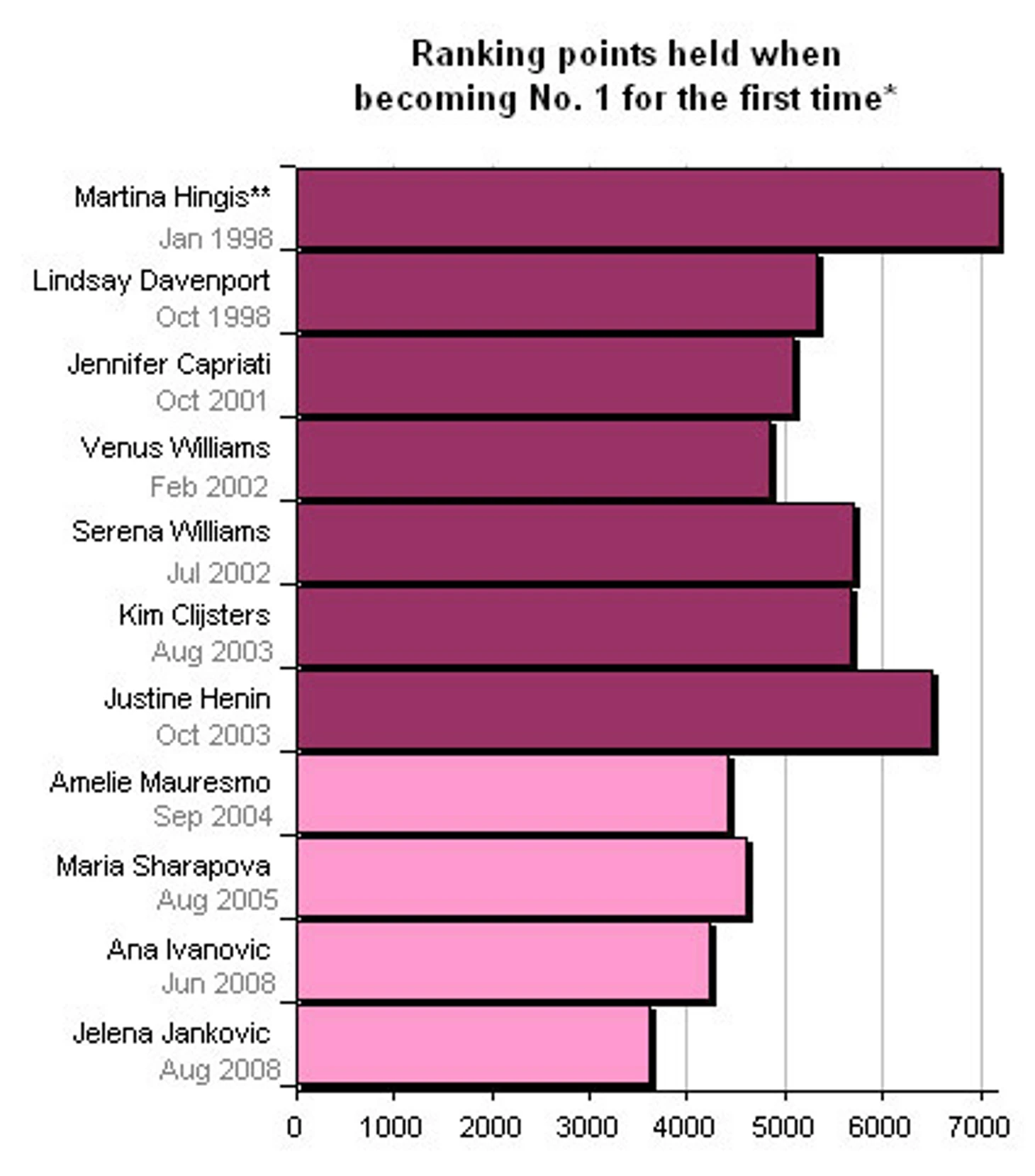 По объективному показателю � количеству рейтинговых очков в момент восхождения на первую строчку � очевидно, что последние четыре первые ракетки мира были самыми слабыми в течение десяти лет, а на самом деле за весь период существования рейтинговой системы с 1973 года (см. диаграмму).