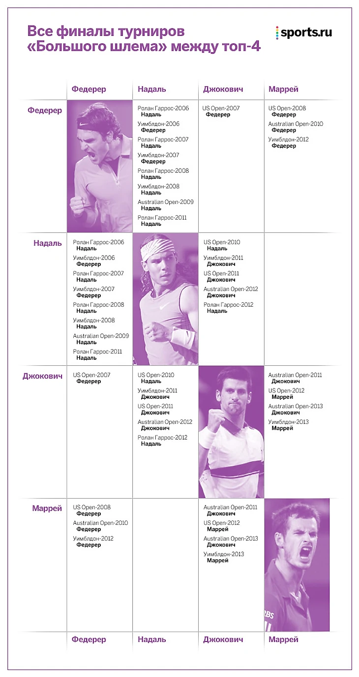 Все финалы турниров «Большого шлема» между теннисистами из Топ-4