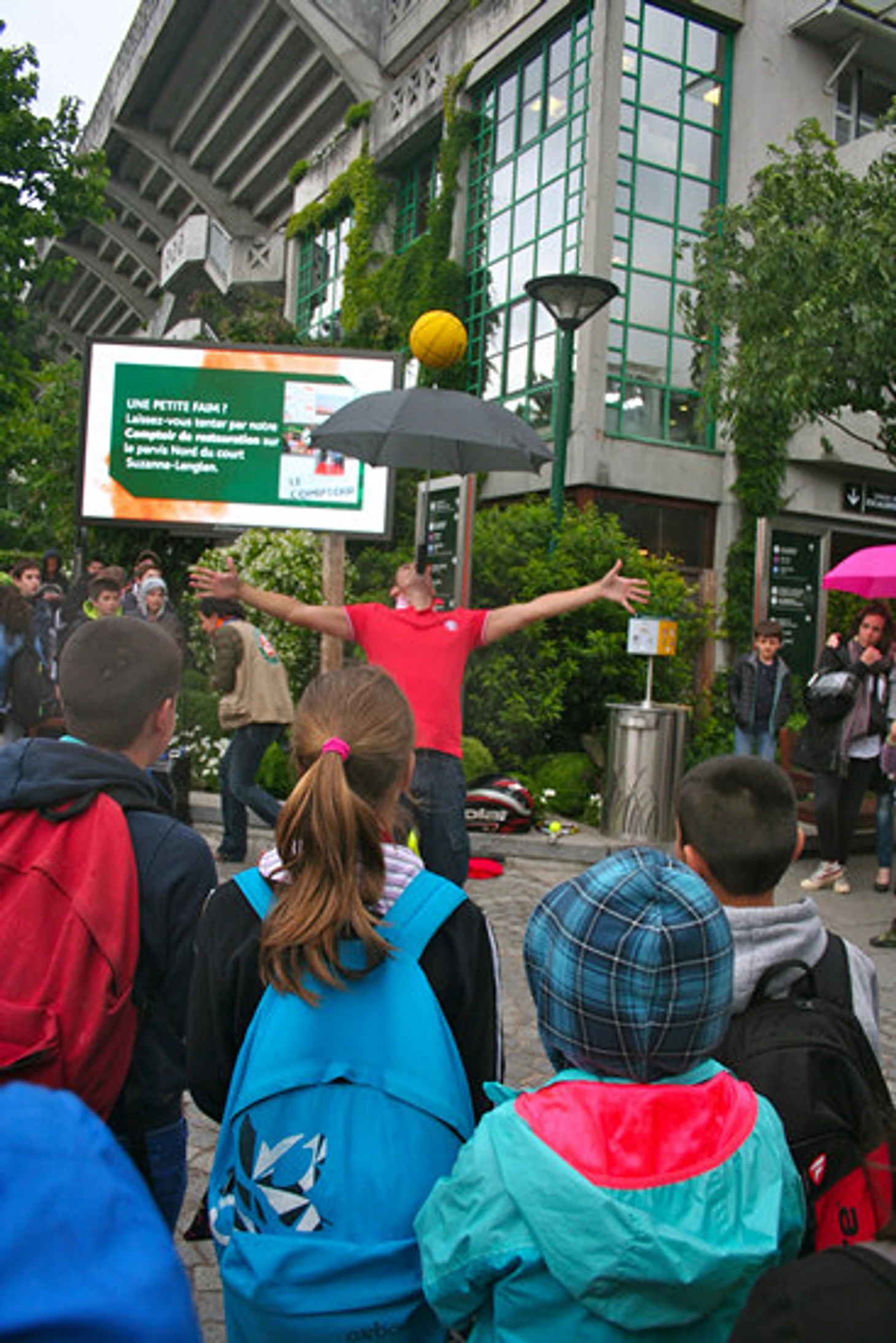 Самых ленивых и занятых развлекают в проходах между кортами артисты цирка, жонглеры, подбрасывая в воздух теннистные ракетки и аксессуары.