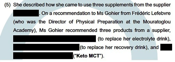 Лефебвр рекомендовал три добавки – их названия в решении вымараны. Одна должна была заменить напиток с электролитами, вторая – напиток для восстановления, а третья как раз и оказалась виноватой в положительной допинг-пробе, по версии Халеп.