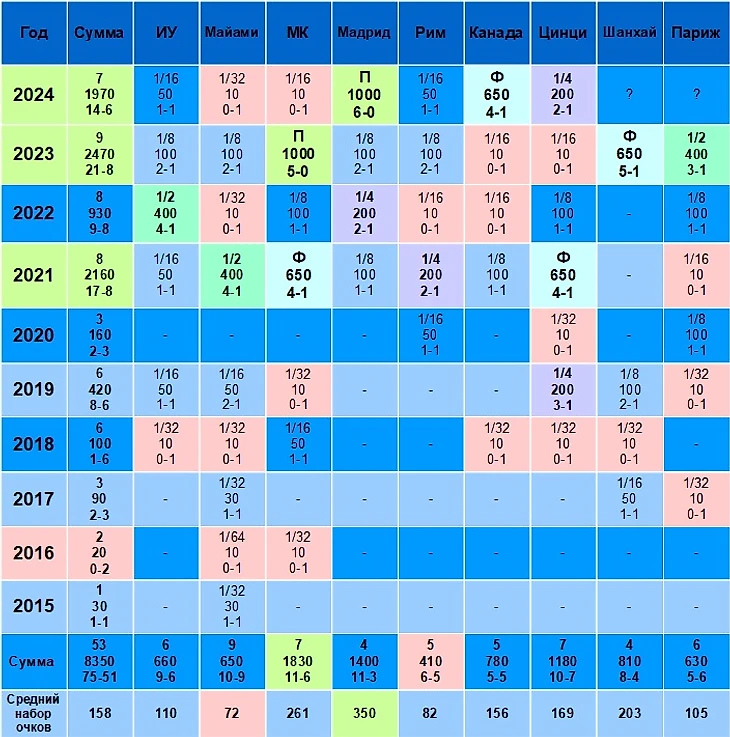 Дальше совсем уж мало... Итак, 2024 год уже третий год по числу очков на Мастерсах. И вполне может стать вторым, достаточно набрать 200 очков за в Париже-24 и Шанхае-24. Если набрать 500 очков, то 2024 догонит 2023 и разделит первое место. Если набрать больше 500 очков, то 2024 станет однозначно лучшим на Мастерсах за всю карьеру Андрея.
