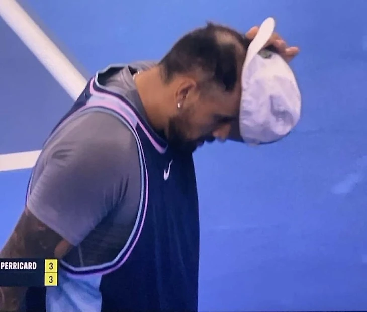 А еще в одиночном матче против Джованни Мпетши Перрикара (который завершился поражением на трех тай-брейках) Кириос поправлял кепку и показал большую лысину.