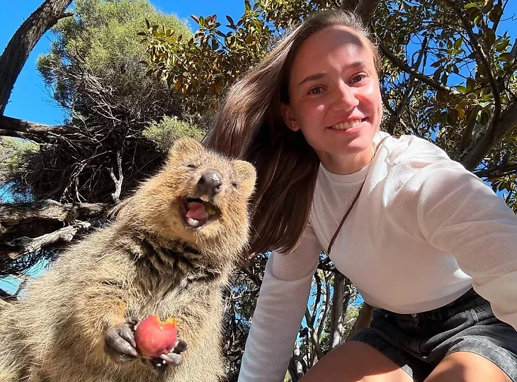 Улыбающиеся Елена Рыбакина и квокка.