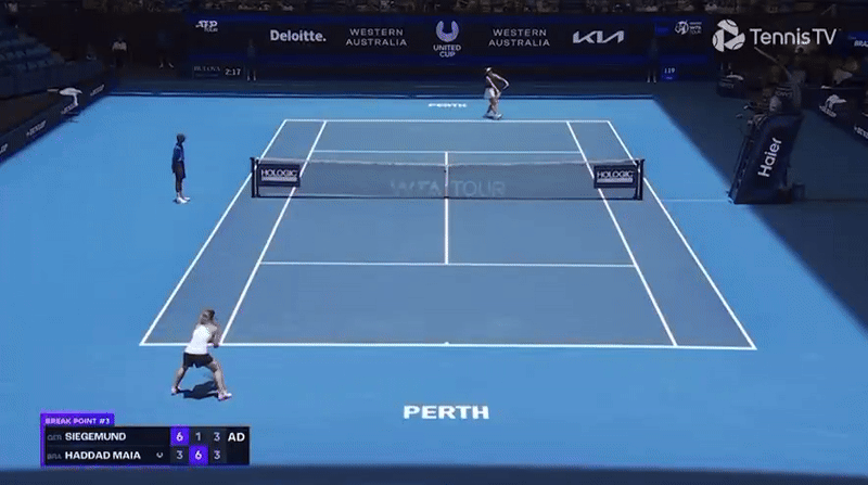Вторая подача Беатрис Хаддад Майи (рост – 185 см) на брейк-пойнте.