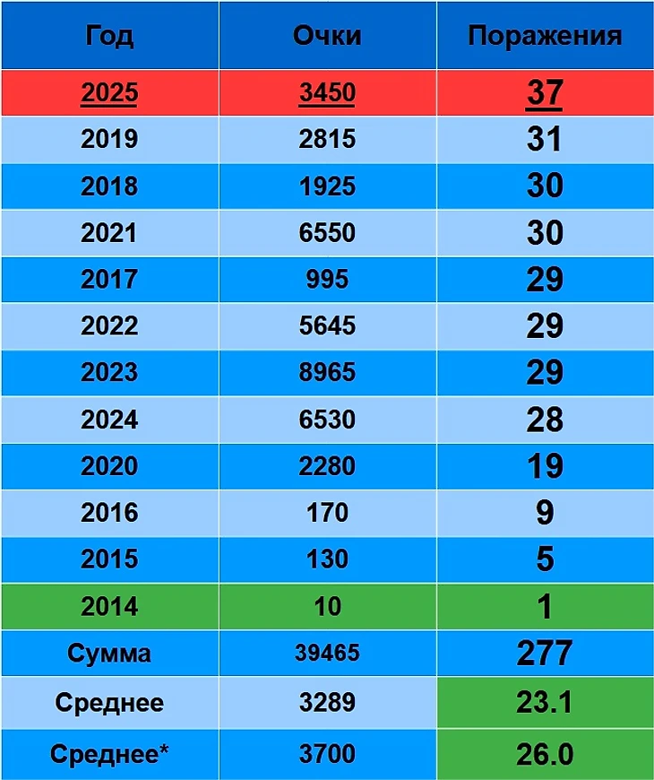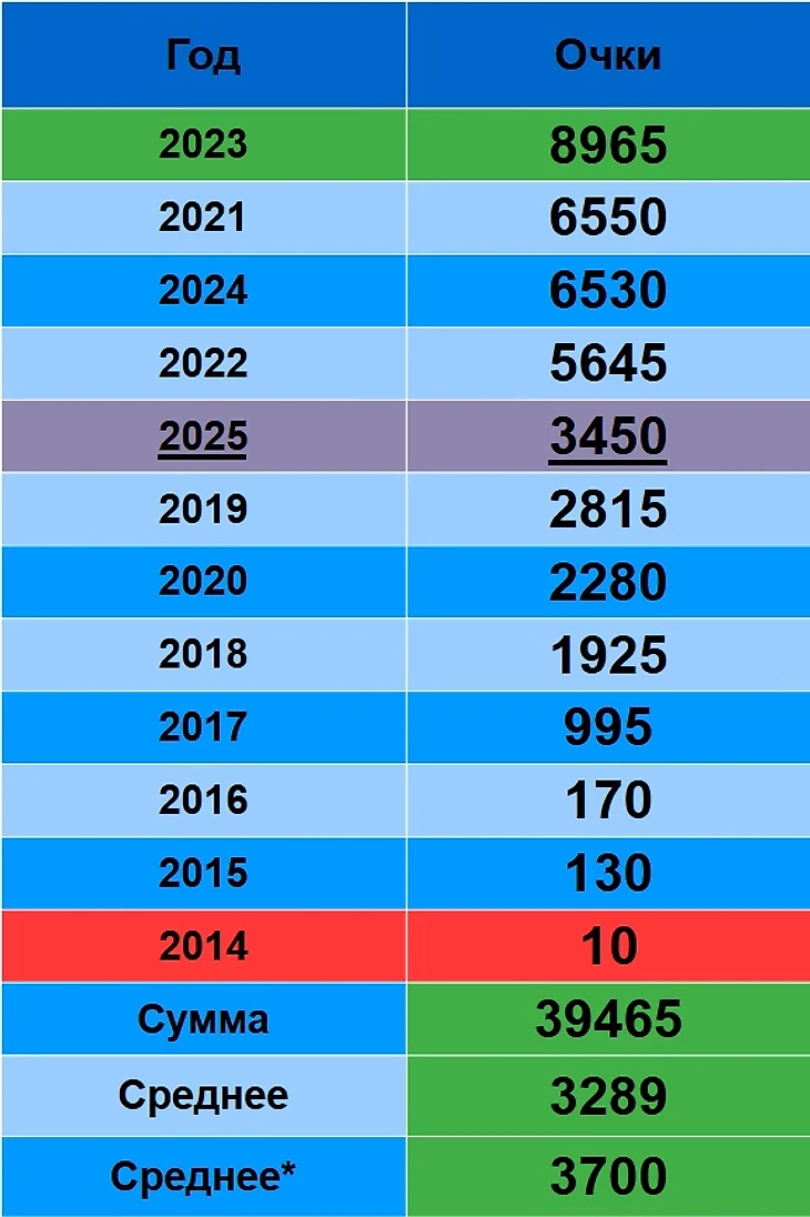 2023 – первый, 2021 – второй, 2024 – третий. 2025 – пятый, но, как же он уступает сезонам 2021-24! Получше обычного среднего(3289), но, чуть ниже «Среднего*»: 3450 очков против 3700, 93.2% от нормы. Получается, сезон провальным назвать нельзя, но, за последние 5 лет – он худший.