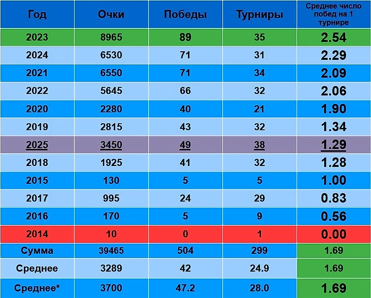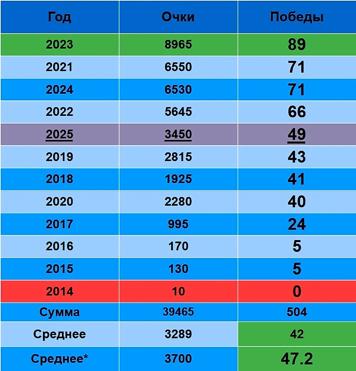 2023 – первый, 2021 и 2024 поделили второе - третье место. 2025 – пятый. 49 побед – чуть лучше среднего результата по карьере у нашей тройки. Однако, «-40» по победам от 2023 года…Вот так и живем)))