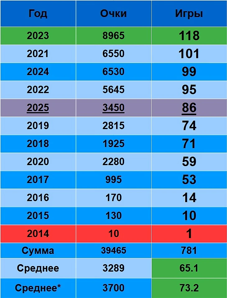 2023 – первый, 2021 – второй, 2024 – третий. 2025 – пятый. Тут все неплохо, игр(86) сыграно немало, больше, что «Среднего»(65.1), что «Среднего*»(73.2). Хотя, 118 игр в 2023, все равно смотрятся сейчас, как с другой планеты…