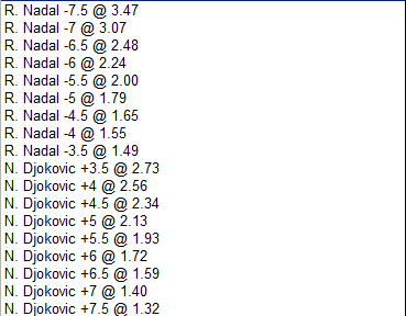 Я думаю в этом матче лежит много хороших ставок на минусовую фору на Надаля. Коэффициенты действительно шикарные, а поскольку я последнее время делаю ставки на бесплатном мониторинге betsec.com, а они дают коэффициенты Пиннакла, то показываю их: