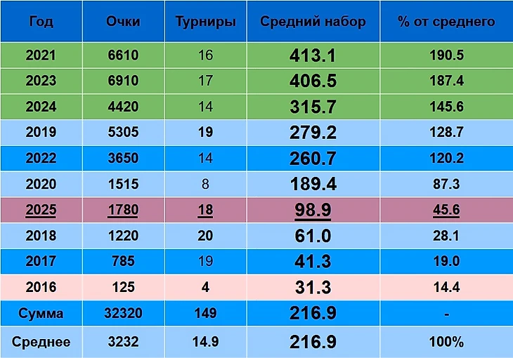 Надо заметить, что, если убрать из числа турниров ОИ-2021 и ОИ-2024, за которые очки не начислялись, то результат 2021 равен 440.7 очка, результат 2024 – 340 очков.