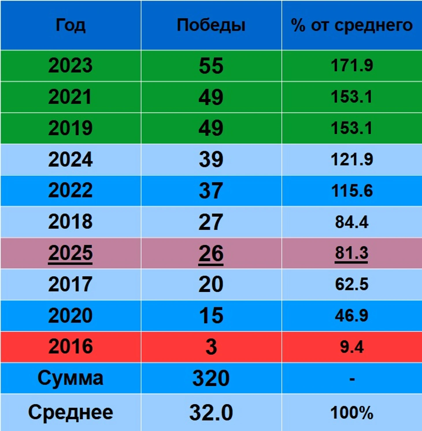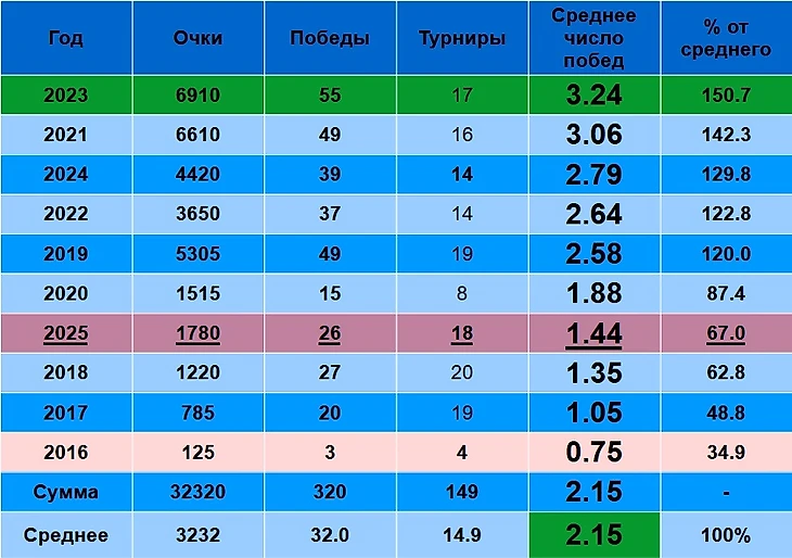 2025 – седьмой, уже на 6 побед меньше среднего результата за карьеру.