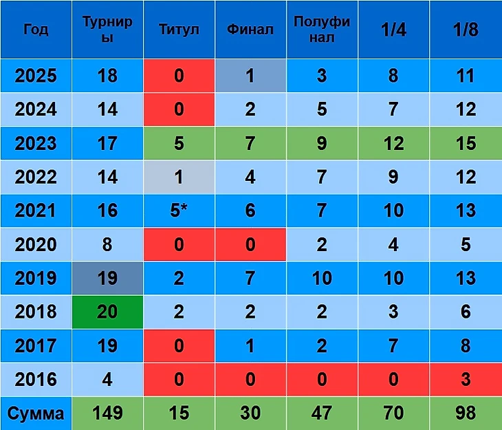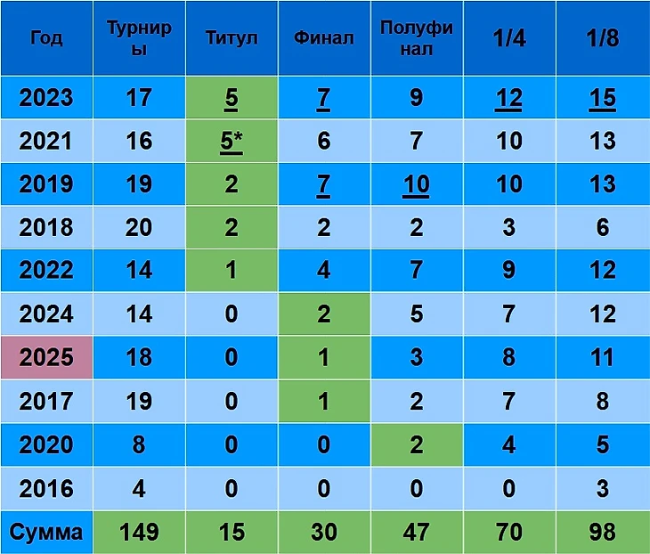 В 2021-2024 было 11-14 поражений, в 2025 18 поражений. Много. Почти на 5 поражений больше, чем, в среднем по карьере – 13.4.
