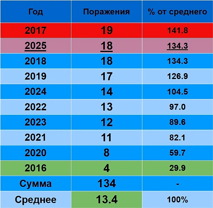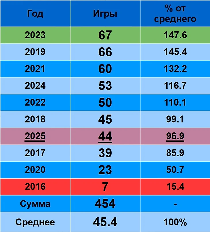 2025 – седьмой, уступая 2023 и 2021 в 4.1-4.2 раза! И даже среднему результату уступает в 2.19 раза.
