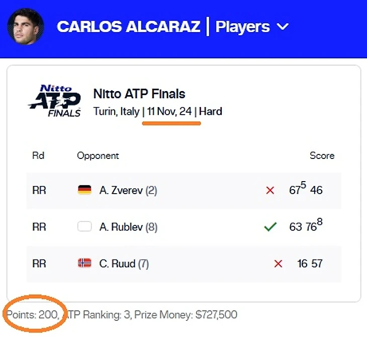 Дело в том, что для всех, кроме восьми лучших теннисистов года, сезон закончится 8 ноября, а уже 9 стартует Итоговый Nitto ATP Finals. И за него тоже начисляют и списывают очки официального рейтинга. В прошлом году выиграл Янник Синнер и получил 1500 очков, которые в этом сезоне составляли основу его комфортного отрыва от второго места. А вот Карлос Алькарас на прошлом Итоговом сыграл посредственно и заработал лишь 200 очков.