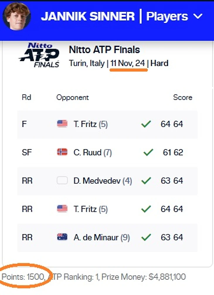 Но в таблице призов Итогового турнира нет такой цифры. Есть 800 очков финалиста и 1500 очков победителя. Даже выигранный Париж и проигранный финал Турина не дадут Синнеру титул первой ракетки по итогам года: