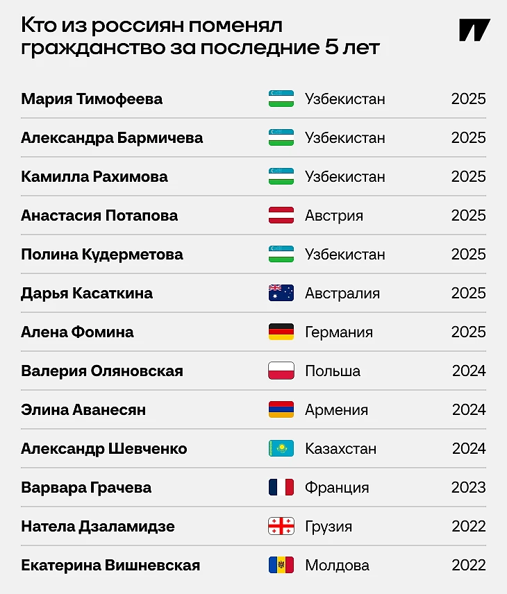 Всего в истории российского тенниса (после 1993-го) мы насчитали 36 примеров смены гражданства. Получается, что за последние пять лет случилось больше 1/3 переходов. А в 2025-м случилось чуть меньше 1/7 всех переходов за больше чем 30 лет.