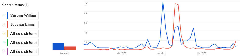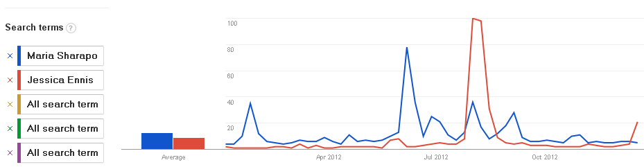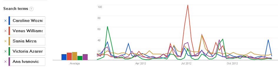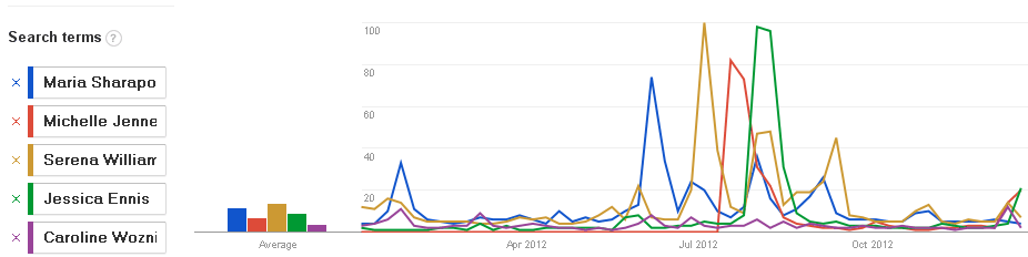 Проверил для ТОП-5 из этого списка. То есть спросил Гугл сравнить и сказать кто из эти ТОП-5 (Джесика, Серена, Мишел, Мария и Каро) действительно имеет больше поисков в 2012 году.