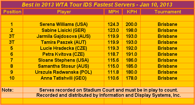 Имейте в виду что эта фирма работает по контракту с WTA и измеряет силу подач только на несколько договорных турниров (кроме ТБШ). В 2013 году такие турниры будут только 11. Эти меры были приняты чтобы установить одинаковые стандарты измерения скорости и избежать ошибок устройств, каких в прошлом часто бывали.