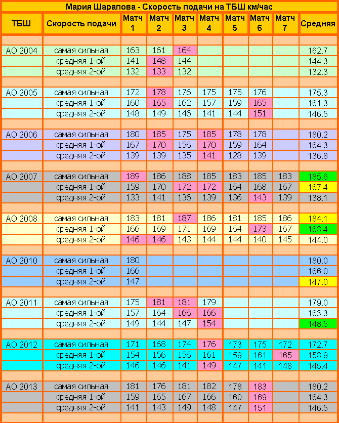 Вот факты. Эта таблица показывает скорость первой и второй подачи Марии во всех ее матчах на АО начиная с 2004 и кончая с 2013 году: