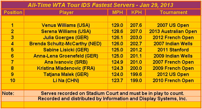 Имейте в виду что эта фирма работает по контракту с WTA и измеряет силу подач только на несколько договорных турниров (кроме ТБШ). В 2013 году такие турниры будут только 11. Эти меры были приняты чтобы установить одинаковые стандарты измерения скорости и избежать ошибок устройств, каких в прошлом часто бывали.