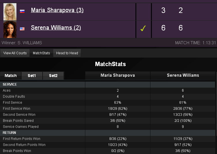 Серена победила Марию в полуфинальном матче, как и ожидалось.