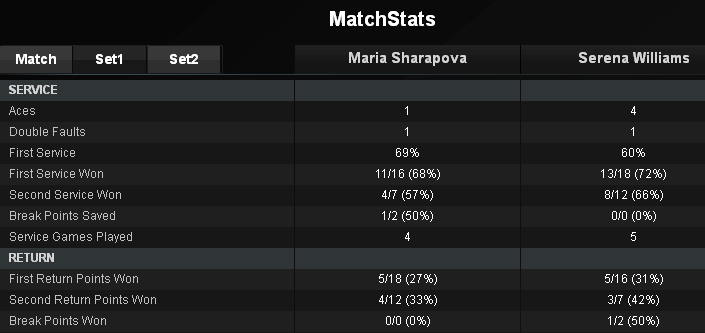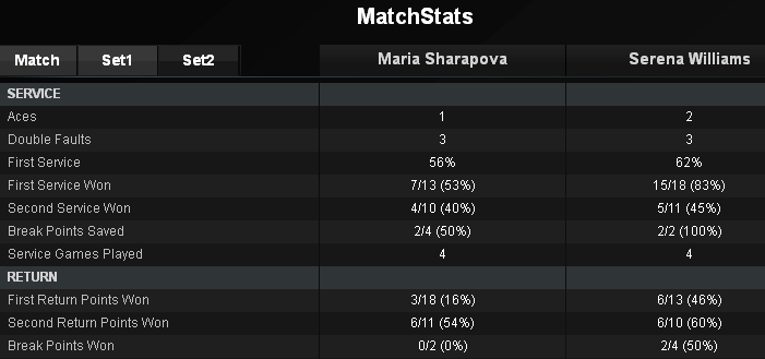 Но есть и что-то положительное и радостное. Мария попробовала и сильные подачи и тогда имела успех, Серена не смогла принять их как надо. Самая сильная подача Марии была 194 км/час. Но задаю вопрос - почему надо было пройти почти год (в Штутгарте будет год) когда стало ясно что Мария может подавать сильнее, а она не подавала? Почему не использовать то, что имеешь более часто? Обсудим и эти вопросы, они тоже очень существенны.