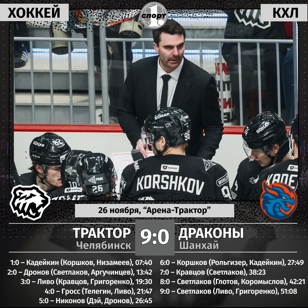 В Челябинске на стадионе «Арена-Трактор имени Валерия Белоусова» прошёл очередной матч регулярного чемпионата Континентальной хоккейной лиги между «Трактором» и «Шанхайскими Драконами». Встреча завершилась победой хозяев со счётом 9:0. В составе победителей шайбы забросили Александр Кадейкин, Григорий Дронов, Джош Ливо, Джордан Гросс, Андрей Никонов, Егор Коршков, Виталий Кравцов и Андрей Светлаков (дубль). Вратарь «Трактора» Савелий Шерстнев записал на свой счёт первый в КХЛ «сухарь». В следующей игре Континентальной хоккейной лиги «Трактор» встретится с «Сочи» дома 28 ноября. «Шанхайские