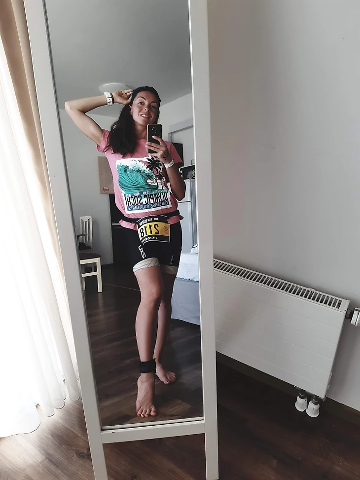 И знаете мысль "что это дорогой вид спорта", "что он не для всех" со временем улетучилась, если вы как любитель- спортсмен едите не за результатом, а за процессом и атмосферой. У меня был самый простой шоссейный велосипед ( где в районе 20 тыс), велотуфли (2 тыс) ,гидрокостюм и трисьют был комбо и вышел в районе 15 тыс, шлем в Декатлоне и там же очки, кроссовки мои любимые asics nossa ( не дорогие и не навороченные) но очень удобные. А на слот мне подарили скидку, потому что я была волонтер ironstar)))