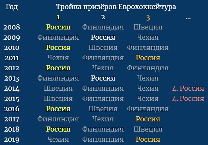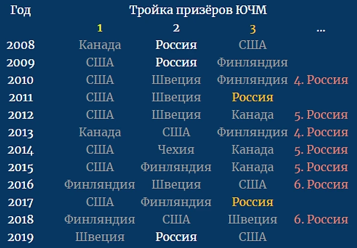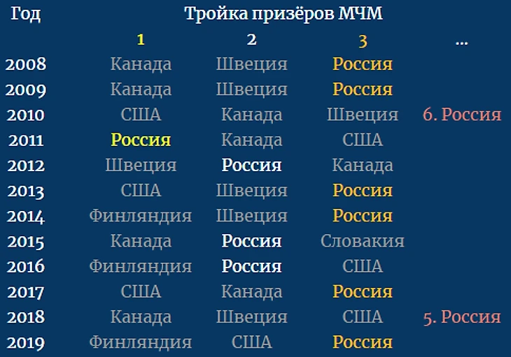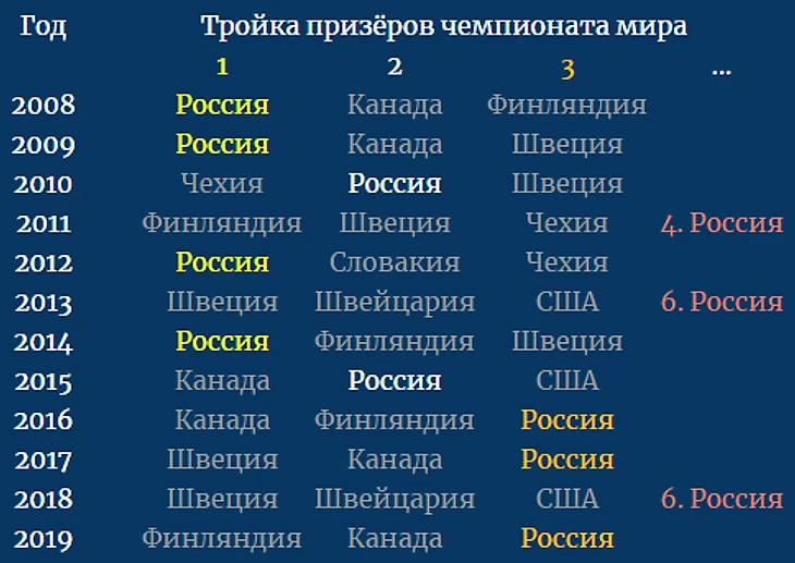 Но к сожалению, тут сложно говорить о каком-то прогрессе. Возьмём период с 2008 года (с появления КХЛ и первой победы сборной России на ЧМ).