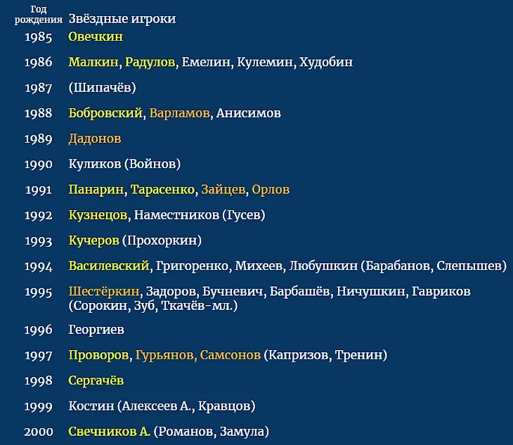 В российском хоккее были удачные возраста, когда появлялось 3-5 и более игроков уровня олимпийской сборной (настоящей, в сильнейшем составе). Были совсем плохие года, давшие по одному игроку. Но есть ли в подготовке игроков какой-то прогресс? Судите сами:
