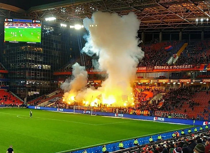 80-ая минута поединка. На секторе основной поддержки столичной команды зажглись фальшфейеры. Яркие огни озарили центр трибуны. Дым пополз по стадиону, на несколько мгновений скрыв из вида игроков.