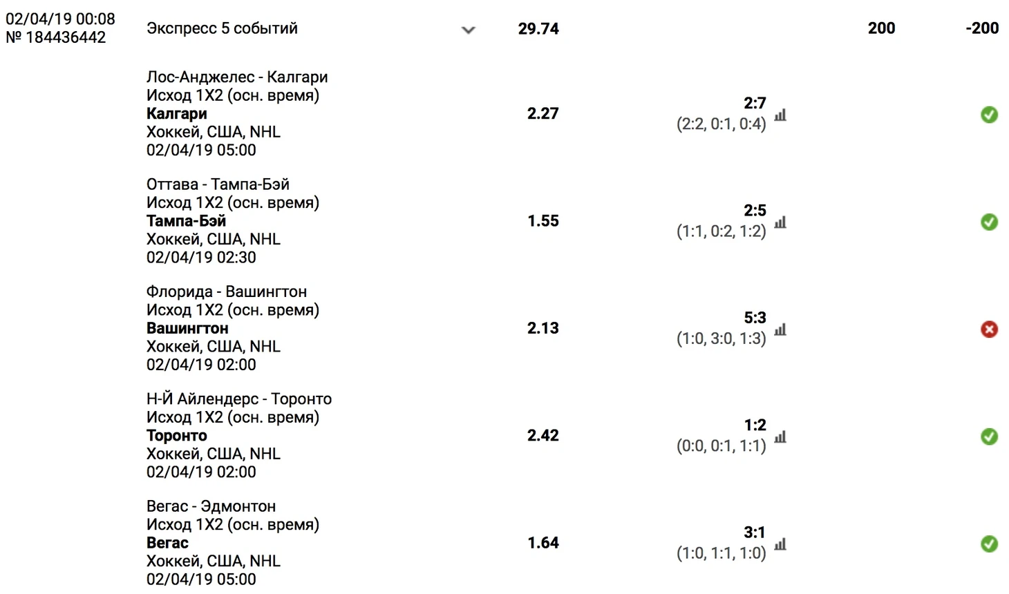 Это пример совершенно рандомного экспресса (ещё и сделанного уже во время матчей), который не зашёл только из-за игры фаворита (ну, только хейтеры "Барсы" могут сказать, что они были аутсайдером матча с субмариной). Собственно, даже если поставить на всех фаворитов, то один обязательно систему сломает. Вот пример с НХЛ.