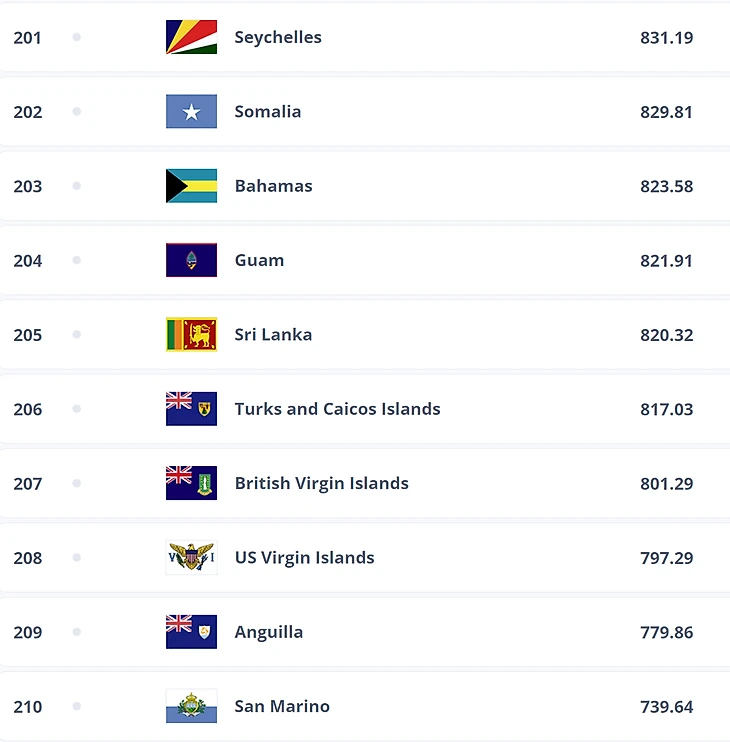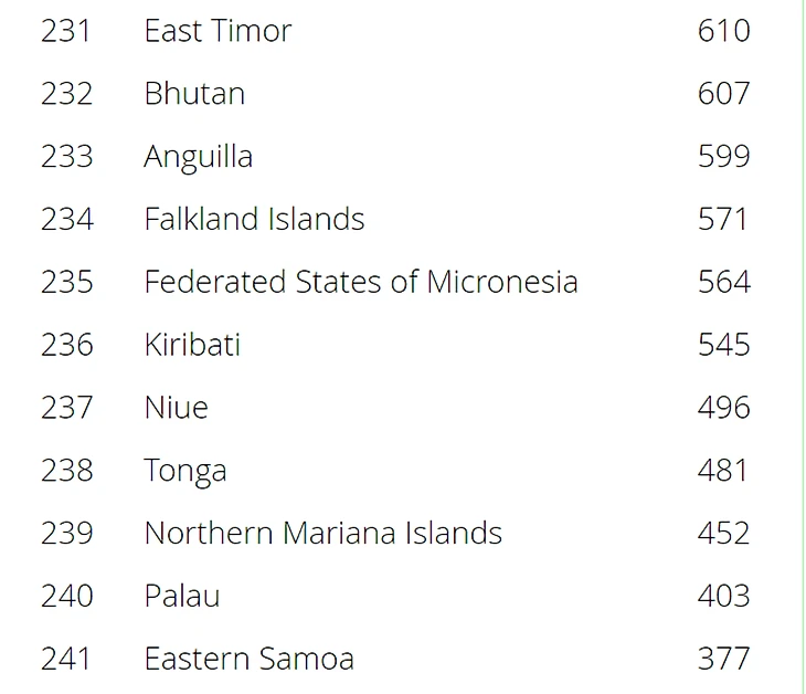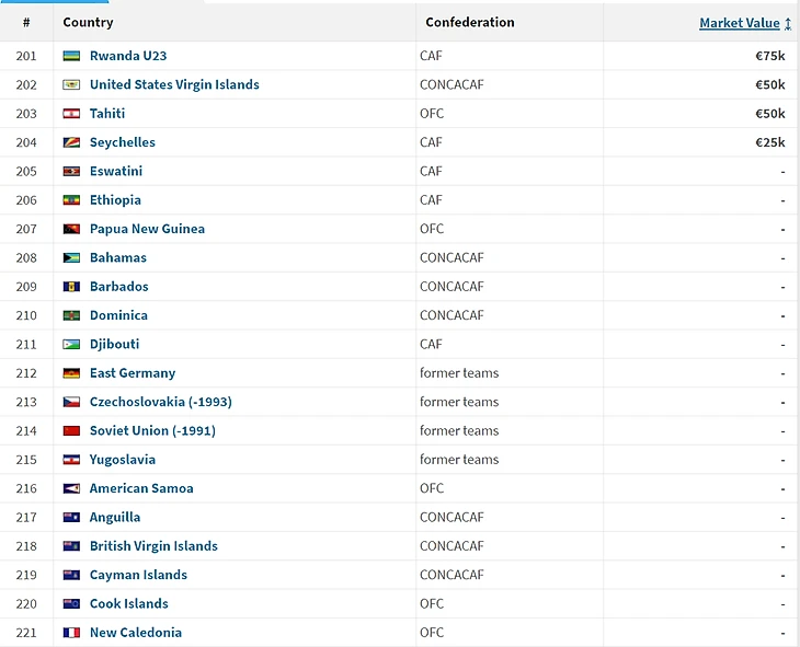 В этом рейтинге можно найти много странных команд, вроде сборной Монако или Гренландии, которые никем не признаются, а также сборные ныне не существующих стран. Но если их игнорировать и обращать внимание только на сборные, которые признает ФИФА, то существует аж 13 национальных команд, в которых вообще нет игроков с оценкой трансферной стоимости. Это Новая Каледония, Острова Кука, Каймановы Острова, Британские Виргинские Острова, Ангилья, Американское Самоа, Джибути, Доминика, Барбадос, Багамы, Папуа-Новая Гвинея, Эфиопия и Эсватини.