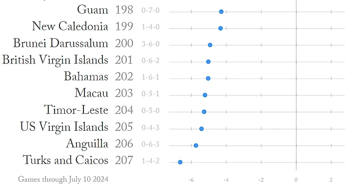 В этом рейтинге последнее 207 место занимает сборная Островов Тёркс и Кайкос. Но этот рейтинг не полный. В нем, по какой-то причине, не представлена часть национальных команд из Океании, которые признаны ФИФА. Поэтому наш предыдущий «победитель» – сборная Американского Самоа оказалась обделена местом в этом рейтинге.