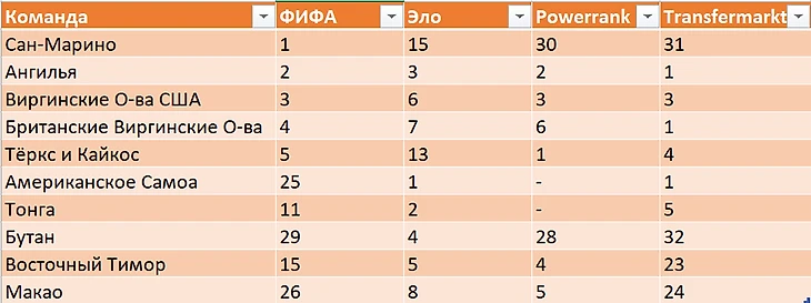 В итоге получилась такая таблица с десятью командами. Разброс позиций получился огромным, особенно, на рейтинге от ФИФА. По этой таблице можно сделать вывод, что рейтинг ФИФА сильно переоценивает сборные из Океании и, как уже неоднократно говорилось, недооценивает жемчужину европейского футбола - сборную Сан-Марино.