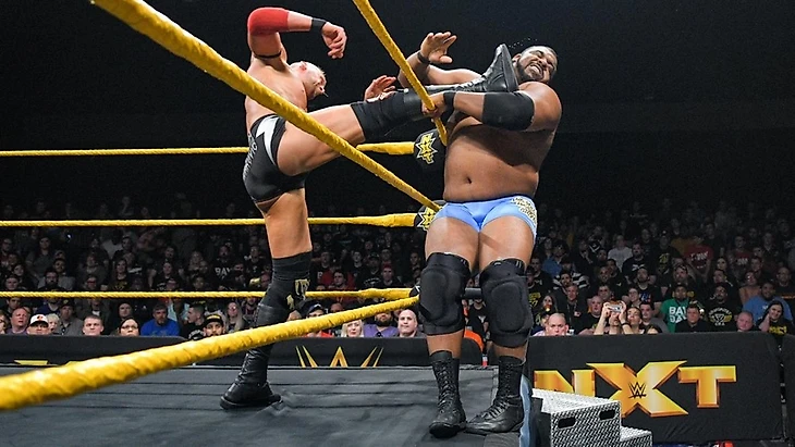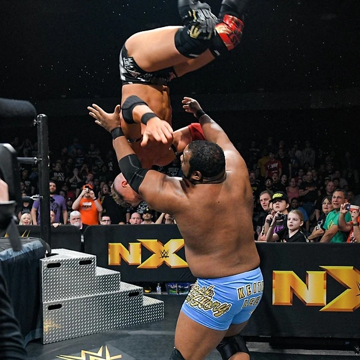 Эти двое здоровяков имели опыт борьбы друг с другом, причем такой, что дядя Дэйв не устоял и выставил им пятерку. Если вы его еще не видели, то гляньте обязательно (можно вот тут), это ж все-таки современная классика. Тут пятизвездочника ожидать не стоило, но зрелище обещало быть «горячим». Начался поединок с агрессивного чейн-рестлинга, после чего рестлеры столкнулись в ринге, но никто не сумел сбить соперника с ног. В итоге исполнители устроили классические разбеги, Кит удивил зрителей лип фрогом, а Донован ушел от попытки некбрейкера. Ли предложил оппоненту рукопожатие, но Дайджакович только оттолкнул его, после чего чуть не попал на пауэрбомбу, попытался попытался перевести ее в манки флип, но Кит приземлился на ноги, чем вызвал овации публики. Донован же был немного шокирован и разозлен, за что провел сопернику чоп, но тут же получил двойной чоп в ответ. Отбившись бутом в углу, Дайджаковч провел еще и локоть со второго каната, принявшись бить соперника, но только злил этим оппонента. В какой-то момент Ли принялся отвечать и отправил в нокдаун соперника мощным локтем, за которым прошел еще один, и шоулдер тэкл вдогонку. От броска Донован ушел, провел суперкик, а затем и сит-аут чокслэм, но только до 2. Еще один полет с третьего каната от Донована, но Ли встретил его двойным чопом, проведя затем свой собственный слэм, но только до 2. От атаки в углу Дайджакович ушел, отправив соперника на апрон, где провел несколько хороших атак, и послал на Кита на рингсайд биг бутом. И на этом Донован не остановился, шарахнув невероятный Асаи мунсолт(!!!). Фанаты принялись чантить «NXT!», а рестлеры не сумели вернуться в ринге до счета 10. Придя в себя, исполнители поспорили с судьями, коих в ринге собралось немало, но, поняв, видимо, что их не переубедить, ринг сначала покинул Донован, а затем и Кит.