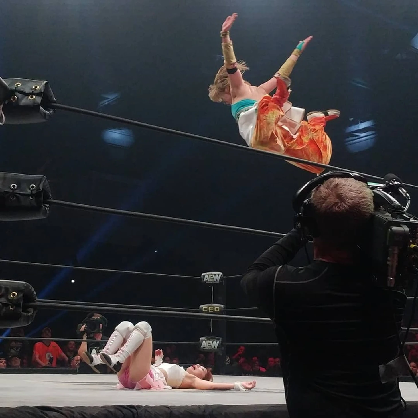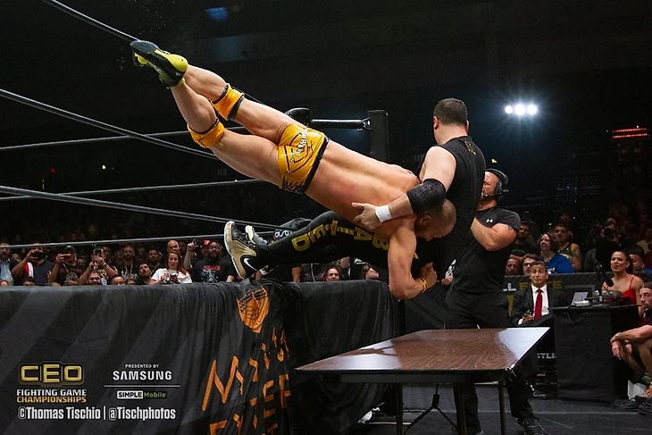 Синхронные пауэрбомбы, но лучадоры вырвались. Следующим моментом стал сплэш в 450 градусов в исполнении Ника на Феникса и Кида, однако удержение разбил Пентагон. Его тут же отправили за пределы ринга. Феникс получил спрингборд фэйсбастер, а Пентагон шарахнул Нику слингблэйд на апроне, чтобы тут же получить дропкик от Мэтта. Мэтт в свою очередь получил дропкик от Ларедо Кида. V-Trigger Ларедо Киду от Омеги. Разбег для дайва в исполнении Кенни, и каттер из неоткуда от Рея(!). И некбрейкер от Ника Фениксу. Young Bucks подготовились к Мельтцер Драйверу Пентагону на рингсайд, но тут в это дело вмешался Феникс, проведя Нику Spanish Fly с третьего каната на Мэтта и Пентагона за пределами ринга. В четырехугольнике же Омега встретил спрингборд атаку Ларедо Кида V-Trigger в полете, провел фэйсбастер, добавил еще один V-Triger, а Однокрылый Ангел поставил жирную точку в матче. The Elite победили в прекрасном матче. После матча нам показали Ноелль Фоли в переднем ряду, а Кенни поговорил чуть-чуть с лучадорами и покинул ринг, раздав «пятюни» комментаторам, зрителям, и пофотографировавшись с некоторыми.