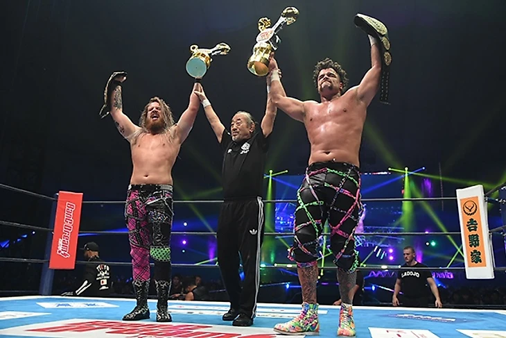 Джадо сопровождал чемпионов. Драку участники матча начали еще на рампе, и Тама с Тангой сумели утихомирить пыл победителей World Tag League 2019, доминируя что на рингсайде над Робинсоном, что в ринге. В итоге реверс DDT позволил Джусу отправить в бой Финли. Тот принялся разносить всех и вся, но работа над травмированном когда-то плече Дэвида, пауэрслэм и командная работа вернули инициативу в руки GoD. В какой-то момент Финли все-таки собрался на гарпун, вернув тэг напарнику, и тот стал уничтожать обоих соперников: спайбастеры, клоузлайны, кэннонболлы, но Лоа все-таки реверсировал одну из атак, провел энзигури и немецкий суплекс, передав тэг Таме. Тот попал под лэг лэриэты, отправив в матч Финли. Слаженная командная работа подготовила практически идеальную почву для пауэрплекс, но Лоа спас матч. Это позволило чемпионам перехватить инициативу, провести командную работу, другую комбинацию, Magic Killer, но Джус совершил сэйв. Magic Killer Робинсону, попытка супер пауэрбомбы Дэвиду, но тот перевел это дело в харриканрану со сворачиванием до 2. Матч уже близился к своему концу, а значит настало время для Джадо вмешаться в матч со своей палкой кендо, но победы это не принесло. Gun Stun у Тонги не прошел, и Финли провел станнер, и Лоа пришлось разбивать удержание. В итоге Робинсону пришлось спасать напарника сначала от соперников, а потом и от Джадо, в честь чего он устроил фестиваль своих Left Hands of God. Pulp Friction и Sliced Bread поставили точку в матче и принесли нам новых командных чемпионов.