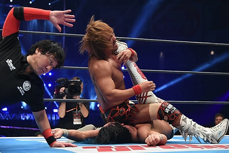 У Окады специальный титантрон и светящаяся накидка. Плавно из классического чейн-рестлинга рестлеры перешли к страйкам, и претендент провел отличную серию ударов, добавив мунсолт до 2. После этого Кота перешел на camel clutch, с большим трудом чемпион дотянулся до канатов, после чего прервал попытки соперника развить инициативу, проведя бэк элбоу, атаку в углу и DDT. Ибуши укатился за пределы четырехугольника, где Казучика впечатал его в ограждение и провел DDT с апрона, и принялся развивать инициативу в четырехугольнике. Толком ничего, кроме DDT он показать не сумел, и Кота вернулся в бой с помощью дропкика. Кик в корпус и снэп пауэрслэм подготовили почву для мунсолта со второго каната, но только до 2. Однако не успел Кота насладиться преимуществом, как Казучика сбил его с угла ринга дропкиком, а на рингсайде отправил в баррикаду, затем бутом в зрительский зал и полетел коронным кроссбади через ограждение. По возвращении в ринг Окада применил Red Ink, и Коте пришлось спасаться у канатов. Доминировать чемпион от этого не перестал, провел локоть с угла и попытался закончить все своим Rainmaker, но Кота парировал, не сумел провести Пеле Кик, правда чуть позже сумел перевести Tombstone в Bastard Driver. Казучика, естественно, попытался совершить камбэк, но был встречен двойным стомпом, от чего чемпион отправился за пределы четырехугольника, где Ибуши провел Golden Triangle. В ринге ко всем бедам Казучики добавился миссл дропики, и Last Ride, как Окада не пытался противостоять, ему. Удержание, и это нирфолл. Bom A Ye у победителя G1 Climax не задался, а Окада провел очередной дропкик и Томбстоун. Rainmaker опять не прошел, но Казучика продолжил доминировать, чем очень вывел Коту, и тот ответил кучей палм страйков, но Окада вернул все на свои места миссл дропиком. Ибуши же моментально поднялся и отвесил целую серию убийственных страйков, пошатнув чемпиона. Совсем слетел с катушек претендент и настолько жестоко избивал чемпиона, что судье даже пришлось его оттаскивать. В результате этого рестлеры очутились на апроне, но lawn dart в рингпост у Коты не прошел, а вот Казучика собрался на Tombstone прям на апроне. В последний момент Ибуши заскочил в четырехугольник, прервав отсчет. Окада добавил некбрейкер, немецкий суплекс, и еще немало всего, но очередной заход на Rainmaker Ибуши ответил собственным жесточайшим лэриэтом. Настало время для коронного немецкого суплекса со второго каната, с чем «Golden Star» справился на отлично, а вот lawn dart Окада перевел в Tombstone с разворотом. Попытка Rainmaker, и Кота отвечает собственным лэриэтом в стиле Окады. 2 Bom A Ye победы не принесли, тогда Ибуши шарахнул хэд кик и колено, и снова чемпион вырвался. Kamigoye не прошел, и из последних сил Казучика собрался на дропкик. Оба упали обессиленными, и едва придя в себя начали обмениваться ударами предплечьями, Окада, казалось бы, победил в этой дуэли, но Ибуши провел серию коронных страйков, закончив ее убийственным хай киком. Далее борцы отправились на угол, вернее Кота стал забираться и прихватил с собой визави. Казучика сбросил оппонента с верхотуры, но взял и влетел в сит-аут пауэрбомб. До 2. «Золотая звезда» вышел на Phoenix Splash. Но мимо. Окада тут же шарахнул Rainmaker, другой. Удержание только до 2. Еще 2 Rainmakers, но третий Кота встретил хэд киком и V-Trigger. Kamigoye не зашел, и чемпион реверсировал атаку Ибуши в сит-аут Томбстоун, завершив бой классическим, каноничн