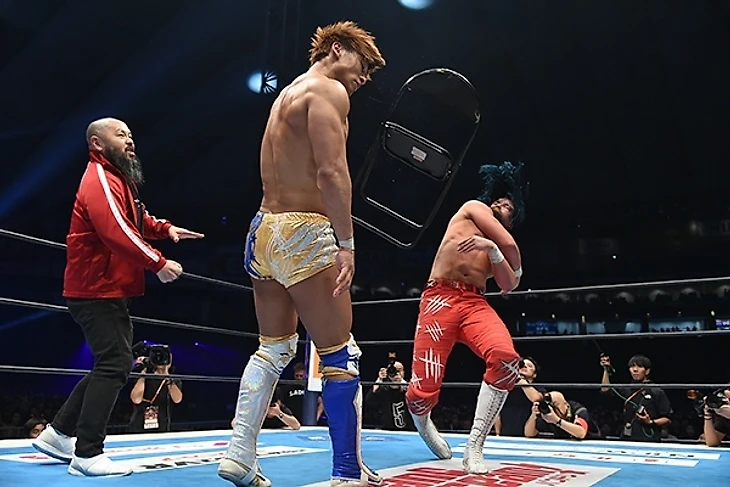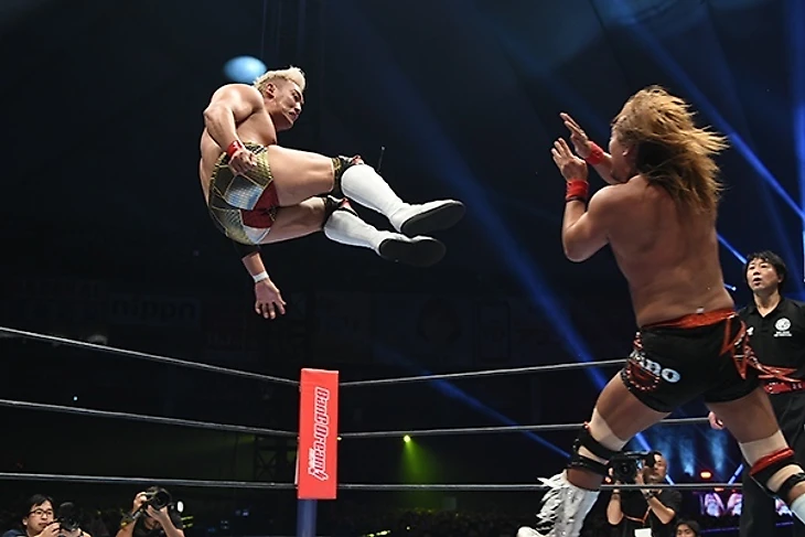 Лидер LIdJ только решил начать прокатываться катком по мировому чемпиону и чуть было не упустил эту возможность. Хотя - всё же упустил из-за внезапного как RKO дропкика от Окады, Найто аж перевернуло, а Казучика настроился атаковать дальше. Оба встретились в углу ринга и обменялись атаками, последней стал дропкик Окады, от которого Найто вновь чуть не перекрутило при падении с ринга. Плюс - Окада решил пойти на радикальные меры, травмируя ноги Тетсуи и используя при этом баррикады со столом комментаторов. Ситуация для ИК-чемпиона сложилась крайне критической - начался отсчёт рефери и Найто с большим трудом добрался до ринга и не проиграл по отсчёту, однако в эту секунду его настиг Окада с missle-дропкиком, но удержание было сорвано до 2. И здесь мировой чемпион IWGP резко закрепил обхват - как не пытался Найто, Окада провёл свой суплекс. Хотя вскоре и Тетсуя ответил Swing Destino, заставив Казучику почувствовать боль. Дальше Казучике от Найто прилетел Evolucion-дроп и Тетсуя почувствовал момент - он взял и провел reverse-франкенштайнер на Окаде с третьего каната, но и тут удержание сорвалось на 2. Мировой чемпион IWGP никак не собирался уступать и это привело к обмену ударами в центре ринга, в котором оба никак не щадили друг друга и при этом было место реверсами - это окончилось Destino Найто, правда и тут удержание было снова до 2.