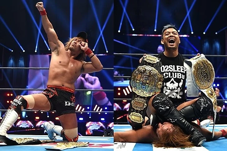 Данный промах не расстроил Тетсую, только вот со вторым финишером уже не так повезло - он сорвался и Окада ответил дропкиком во время второй разгонки Найто. Зрители уже были на взводе из-за данного матча, а бойцы уже выглядели крайне истощёнными - они с трудом поднимались на ноги и не переставали проводить удары друг по другу. Это развивалось не спешно, но в то же время и с большим напряжением - отчего оба смогли встать на ноги и продолжить работать на ускорение темпа. Что и привело к парочке реверсов и Rainmaker-у - Окаде этого было мало и тот провёл ещё и пайлдрайвер со вторым Rainmaker-ом, но удержание было сорвано на 2. Мировой чемпион в шоке, зрители снова на волне удивления и Окада пытался что-то пустить в ход для добивки Найто - он не поддался этому напору, плюс стал плеваться в Казучику, на что последний ответил травмированием колена Тетсуи. ИК-чемпион IWGP стал выглядеть совсем плохо из-за такой тактики действий Окады, плюс ещё Каз стал добавлять полу-Rainmaker-ы. Мировой чемпион почувствовал момент для полного финишера - и тут с третьей попытки Найто ответил Destino, удержание было сорвано на 2, опять. Тетсуя уже был готов заканчивать это безумие и после бодислэма...осилил Stardust Press - удержание ВНОВЬ СОРВАЛОСЬ НА 2!!! Окада реально оказался крепче обычного, только вот Найто не собирался так просто сдаваться - Казучика пресёк четвёртый заход на Destino для своей атаки. Но сразу же схватил связку из Gloria-DDT и третьего Destino - и был окончательно удержан Тетсуей Найто до 3. История была сотворена - Тетсуя Найто стал первым двойным главным чемпионом IWGP!!!