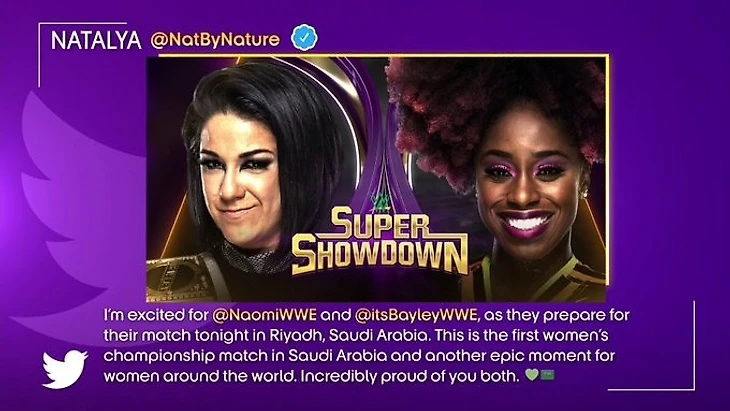 — Не обошли стороной специальный твитт, оставленный участницей прошлогоднего и первого в истории женского матча от WWE, прошедшего в Аравии - Натальи. Она поддержала Бэйли и Наоми, которым предстоит снова сотворить историю - провести первый титульный бой за женское чемпионство SDLive WWE;